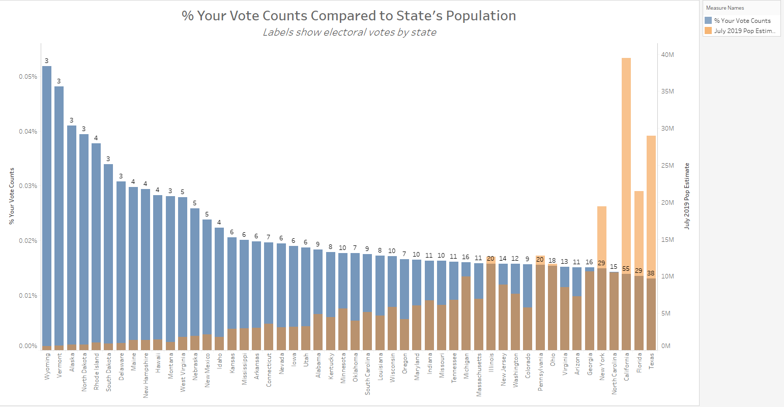 Visually represented, we can see that a person’s vote in Wyoming can sway their electoral vote in their favor 5 times more than a person voting in Texas. (A voter in Wyoming has a 0.05% impact on their electoral college vote vs a voter in Texas that has a 0.01% impact.)